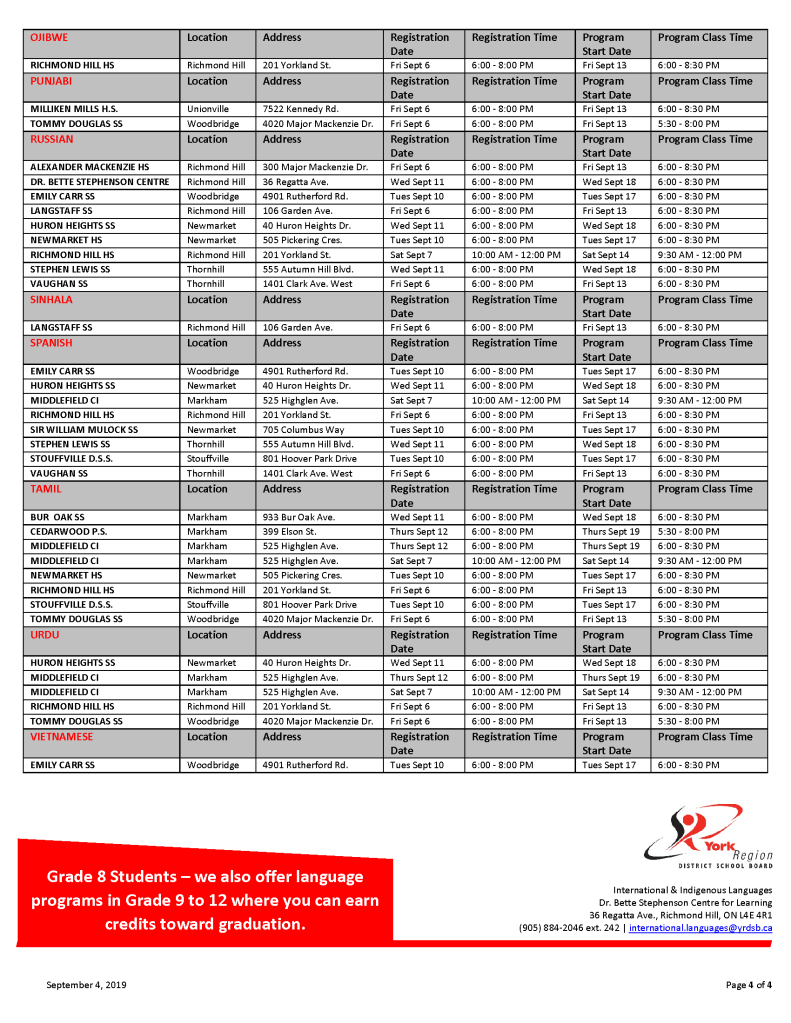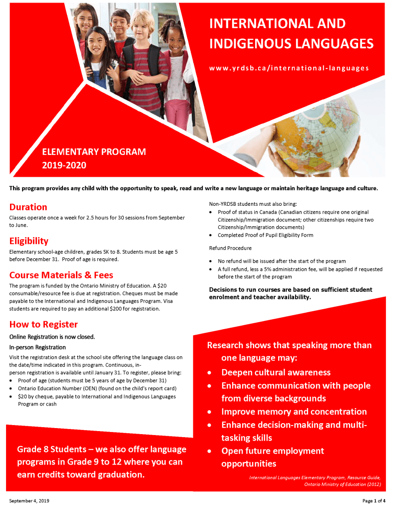 York Region District School Board’s Elementary International and Indigenous Languages Program is pleased to offer over 20 languages at 35 different sites from Tuesday to Friday evenings, and Saturday mornings. Our Board has one of the largest International and Indigenous Languages programs in the province with approximately 15,000 students who register each year. Classes run 2.5 hours once a week for 30 weeks for Elementary SK-8 students who want to learn a new language or maintain their heritage language. The cost for the entire program is $20.00. Program brochures will also be sent home from your child(ren)’s school. We would like to share with you our program information: