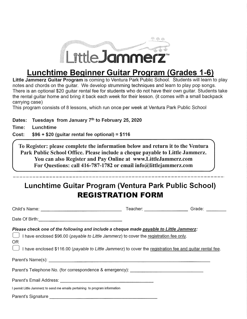 Little Jammerz – A Beginners Guitar Lunch Hour Program Coming to VPPS! Posted on November 8, 2019 by Ventura Park P.S. See flyer below for information on how to register your child for this lunch program starting in January. Author: Ventura Park P.S. View All Posts