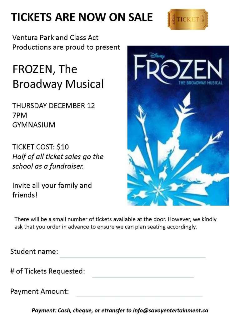 Tickets for our lunch program “Frozen, The Broadway Musical” are now available for purchase.The show will take place on Thursday, December 12th at 7pm in the VPPS Gym. Please see flyer below for more information.