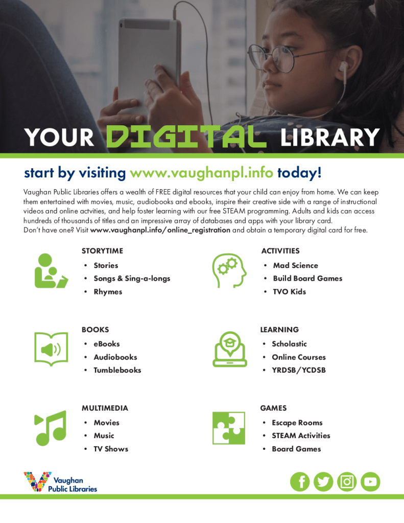 They are able to offer FREE audiobooks, e-books, learning courses and more, all of which can be accessed at www.vaughanpl.info. Just click on the GET STARTED button in the middle of your screen to see the services they have available separated by age group. To borrow items from the library, you will need a library card, and if you do not have one, you can receive a temporary digital online by visiting www.vaughanpl.info/online_registration