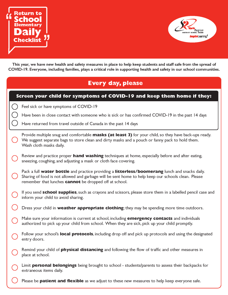 This year, we have new health and safety measures in place to help keep students and staff safe from the spread of COVID-19. Everyone, including families, plays a critical role in supporting health and safety in our school communities. Please carefully review the attached daily checklist, provided by the YRDSB, before school each day. As a reminder, students in Grades 4-8 must wear a mask and it is strongly recommended that students in Grades 1-3 wear a mask.