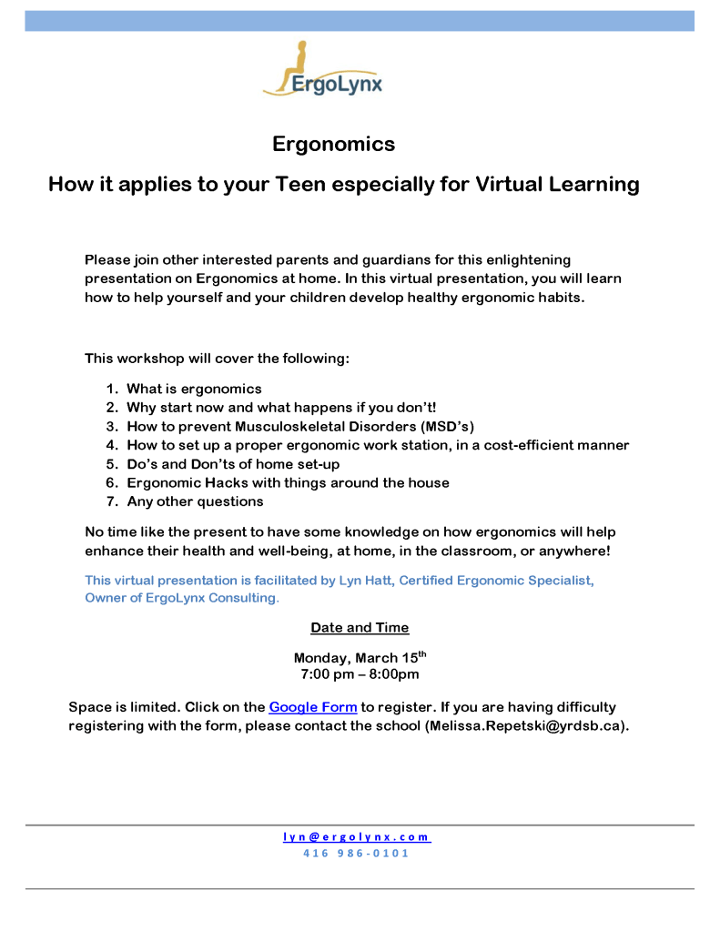 Please join other interested parents and guardians for this enlightening presentation on Ergonomics at home. In this virtual presentation, you will learn how to help yourself and your children develop healthy ergonomic habits.