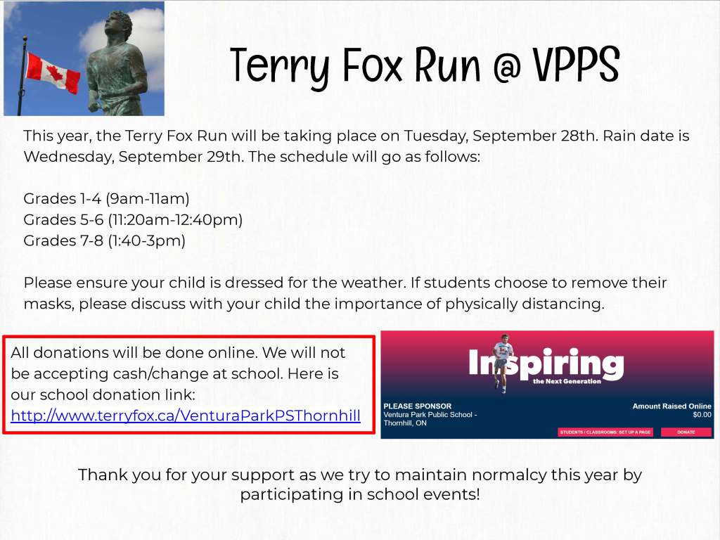 Terry Fox Run News Posted on September 20, 2021 by Ventura Park P.S. For donations, please go to : http://www.terryfox.ca/VenturaParkPSThornhill Author: Ventura Park P.S. View All Posts