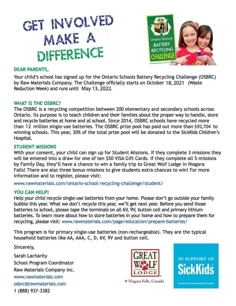 To help do our part in protecting the environment, Ventura Park P.S. is competing in the Ontario Schools Battery Recycling Program Challenge! From now until May, please send any used batteries that need to be recycled with your child to school. There will be designated recycling bins where they can drop them off. The more we collect, the more chances we have at winning the grand challenge prize, $2000 for our school!
