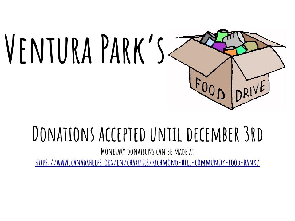VPPS Food Drive Posted on November 22, 2021October 26, 2021 by Ventura Park P.S. For financial donations please click here or go to:https://www.canadahelps.org/en/charities/richmond-hill-community-food-bank/ Author: Ventura Park P.S. View All Posts