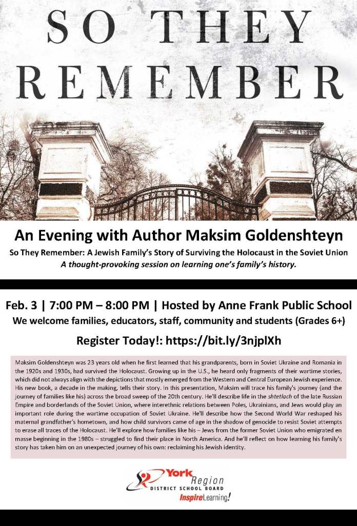 As part of ongoing Holocaust Remembrance events by the YRDSB and community partners, families are also invited to register for an evening with author Maksim Goldenshteyn being hosted by Anne Frank Public School. Please see the details below.
