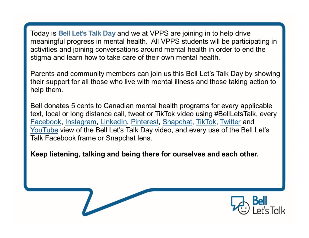 #BellLetsTalk Day Image• Posted on January 26, 2022 by Ventura Park P.S. Links for Bell Let’s Talk Day Videos: Facebook, Instagram, LinkedIn, Pinterest, Snapchat, TikTok, Twitter and YouTube Author: Ventura Park P.S. View All Posts