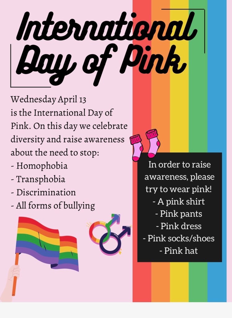 when communities across Canada and across the world unite to celebrate diversity and raise awareness about the need to stop homophobia, transphobia, discrimination and all forms of bullying. On this annual day in April, individuals wear pink to show respect for diversity and to demonstrate support for learning and working environments which are safe and inclusive of people from all different backgrounds.