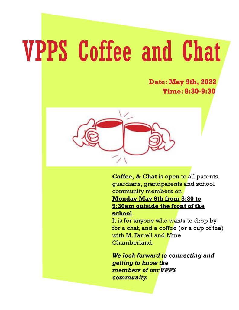 REMINDER: Coffee & Chat is open to all parents, guardians, grandparents and school community members this coming Monday, May 9th from 8:30 to 9:30am outside the front of the school.