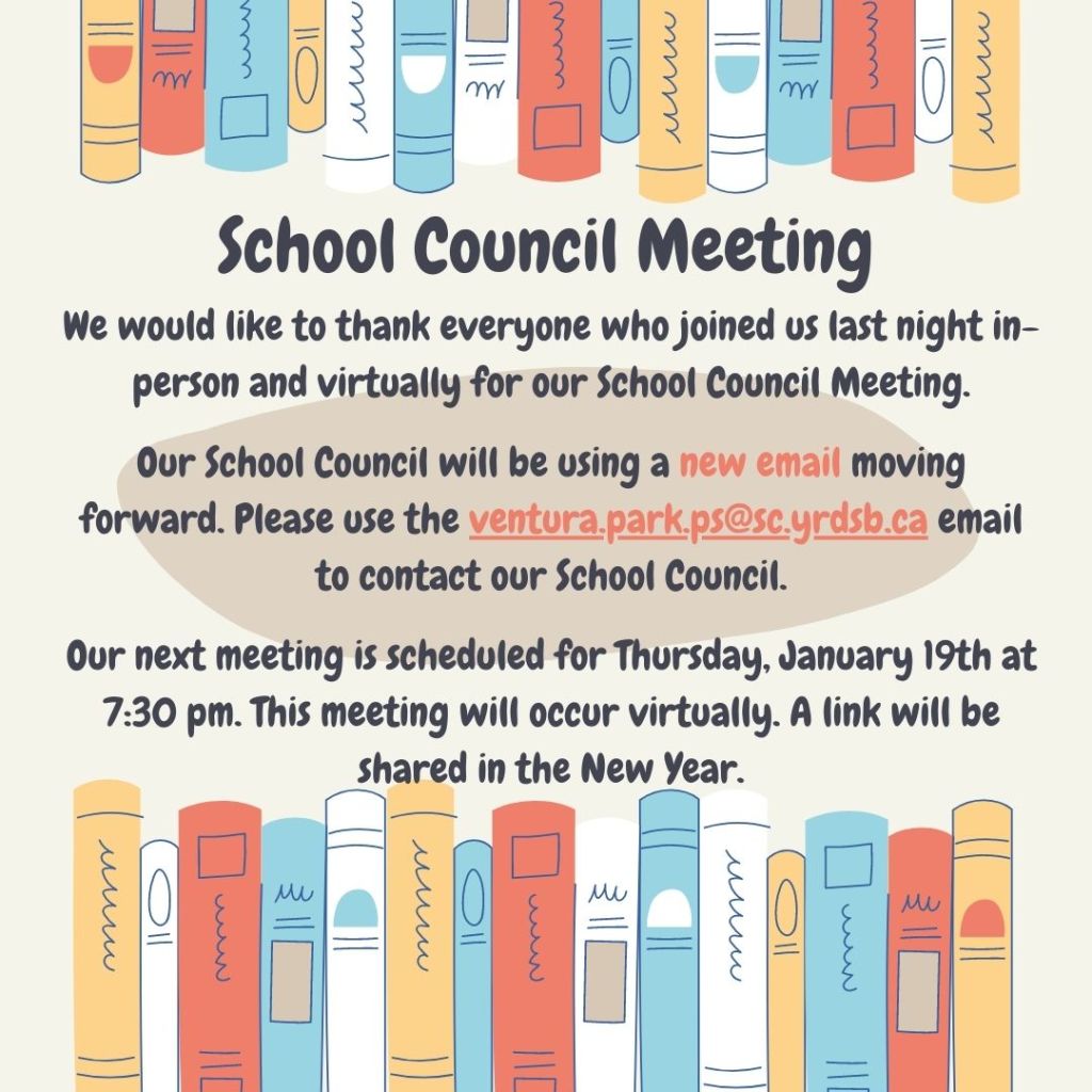 School Council Meeting Posted on November 30, 2022 by Ventura Park P.S. Email: ventura.park.ps@sc.yrdsb.ca Author: Ventura Park P.S. View All Posts