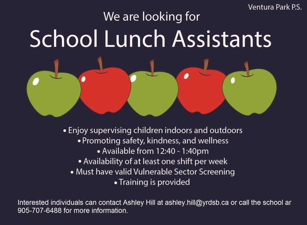 School Lunch Assistants Needed Image• Posted on April 25, 2023April 13, 2023 by Ventura Park P.S. Author: Ventura Park P.S. View All Posts