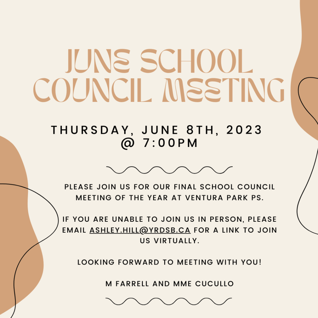 June School Council Meeting Posted on June 4, 2023June 3, 2023 by Ventura Park P.S. ashley.hill@yrdsb.ca Author: Ventura Park P.S. View All Posts