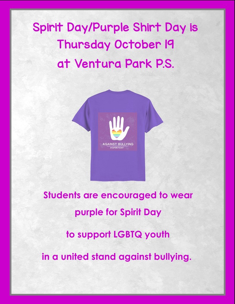 Purple Shirt Day Reminder Image• Posted on October 18, 2023October 16, 2023 by Ventura Park P.S. Author: Ventura Park P.S. View All Posts