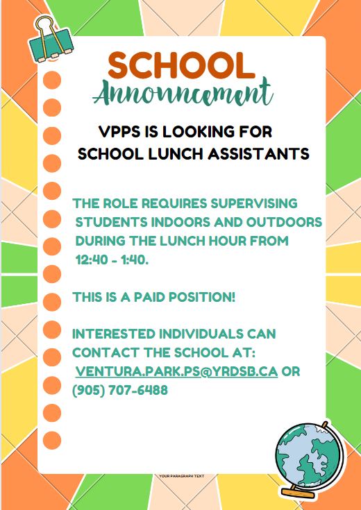 School Lunch Assistants Needed Image• Posted on February 21, 2024February 9, 2024 by Ventura Park P.S. Author: Ventura Park P.S. View All Posts