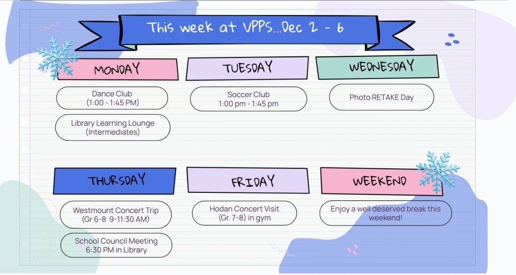This week at VPPS…Dec 2-6 Image• Posted on December 2, 2024November 29, 2024 by Ventura Park P.S. Author: Ventura Park P.S. View All Posts