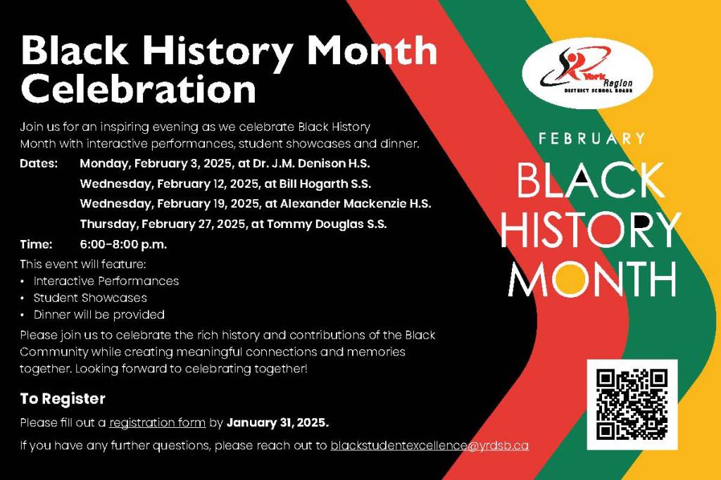 Black History Month Celebration Invitation Posted on January 21, 2025January 21, 2025 by Ventura Park P.S. To register please click hereFor further questions please email: blackstudentexcellence@yrdsb.ca Author: Ventura Park P.S. View All Posts