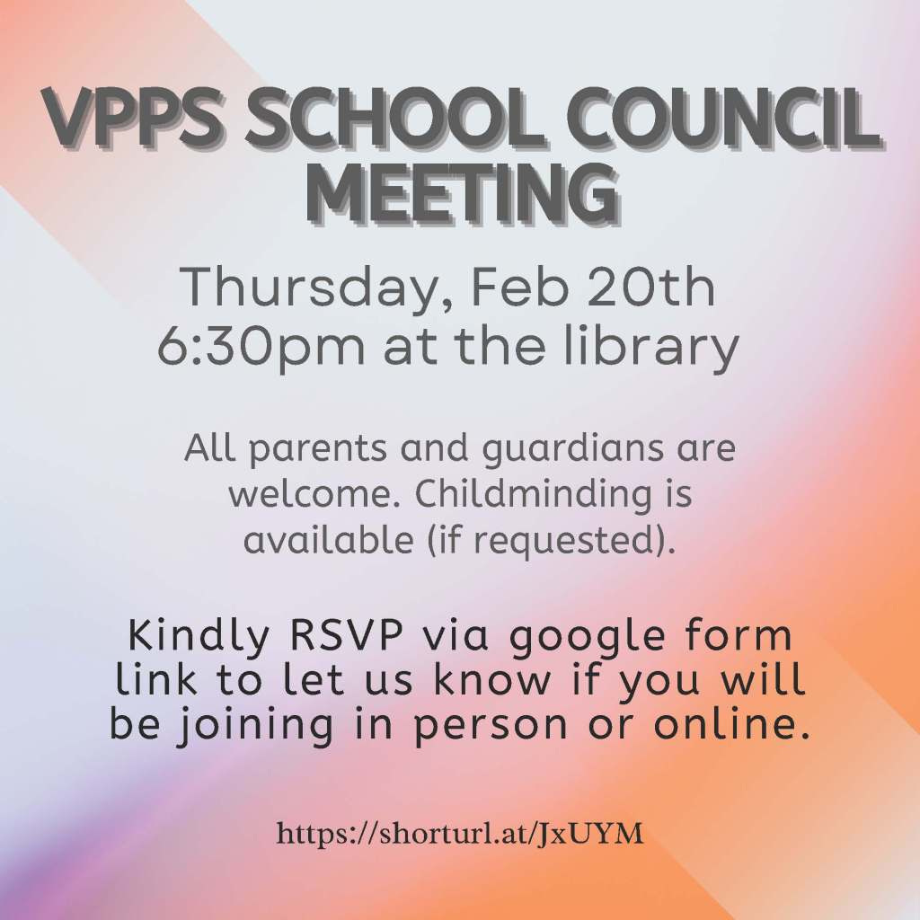 School Council Meeting Reminder Posted on February 17, 2025February 13, 2025 by Ventura Park P.S. Agenda: https://shorturl.at/JxUYM RSVP: https://forms.gle/vgTBfBpzk62GRAqKA Author: Ventura Park P.S. View All Posts