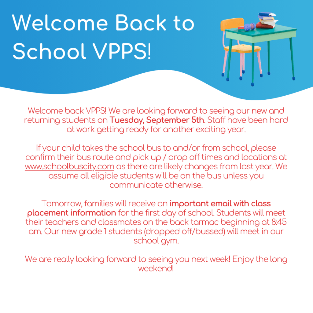 We have had some incredible first days of school here at VPPS, and we wanted to thank everyone for their support as we got this year started. As we move through the rest of this week and in the coming weeks, classes will continue to get to know one another and build a sense of community. Teachers will be sending home communication on how to stay in touch – remember that parents and guardians are important partners in each child’s education and we value the home and school connection.