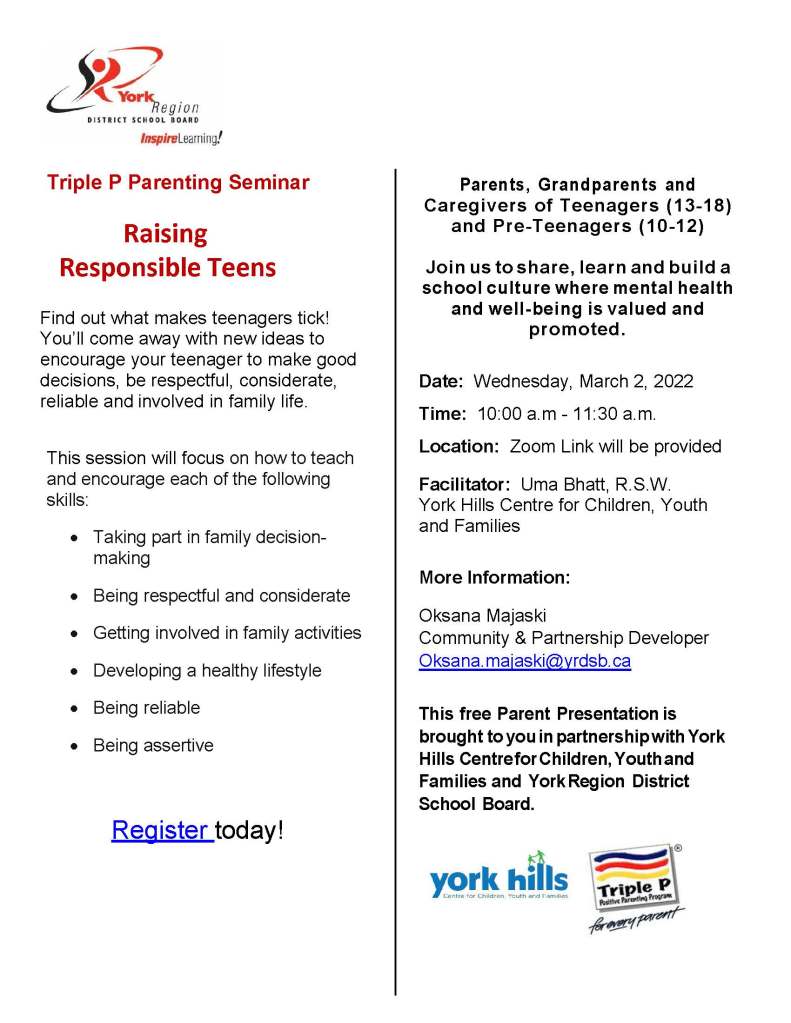 Triple P Parenting Seminar – Raising Responsible Teens Image• Posted on February 28, 2022March 2, 2022 by Ventura Park P.S.